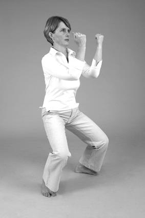 Heben Sie die Arme vor dem Körper hoch, bilden Sie feste Fäuste, halten Sie die Fäuste im Abstand von 20 cm links und rechts vor Ihre Wangenknochen. Die Finger zeigen zum Gesicht.