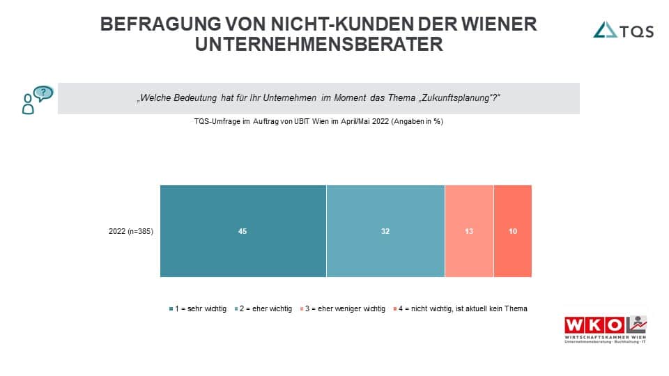 Wien – „Immer mehr KMU fragen sich derzeit, wie es weitergehen soll“, berichtet Claudia Strohmaier, Berufsgruppensprecherin Unternehmensberatung in Wien. Ähnliche Gedanken haben insgeheim aber auch Betriebe, die (noch) keine Unternehmensberatung in Anspruch nehmen, wie eine Umfrage der Fachgruppe UBIT Wien zeigt: Demnach sehen 77 Prozent der Nicht-Kunden eine Zukunftsplanung als „wichtig“ oder „sehr wichtig“ an. Strohmaier zeigt auf, an welchen Hebeln KMU drehen können, um zukunftsfit zu bleiben.
