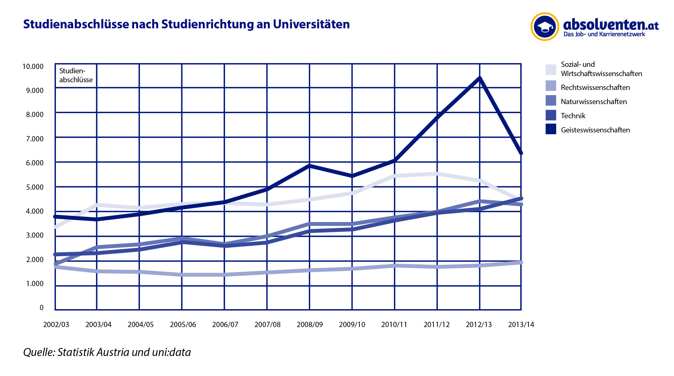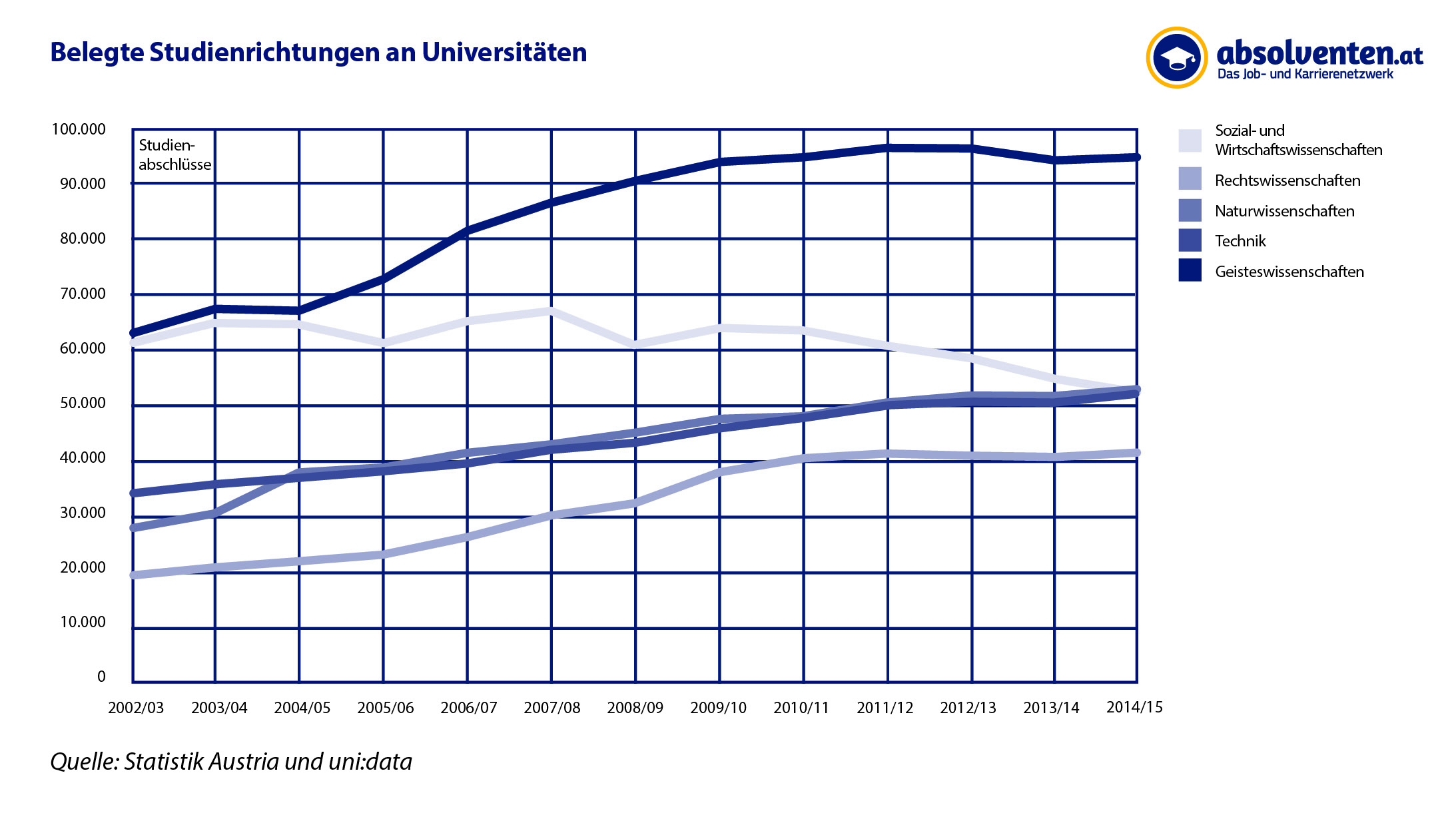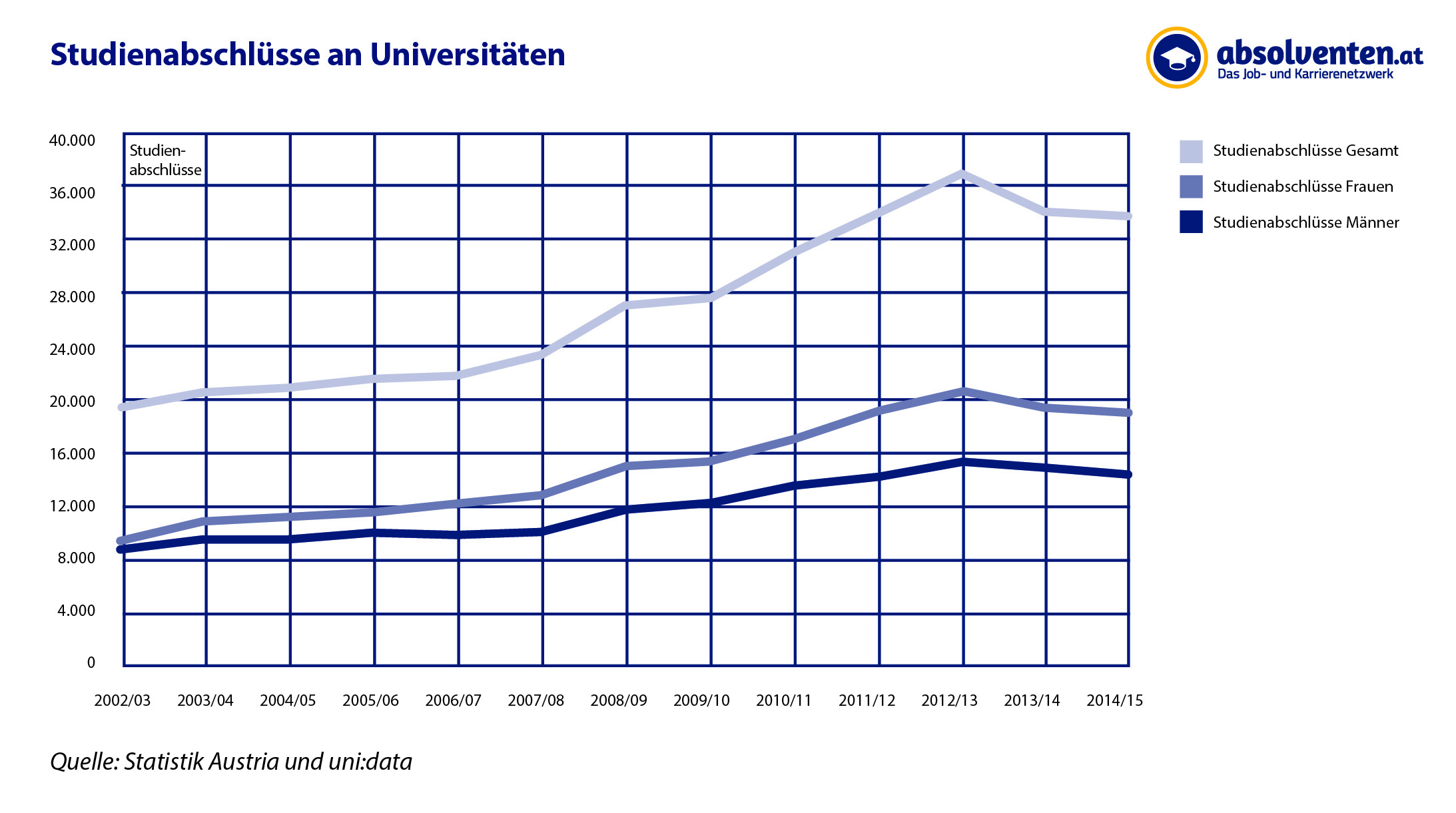 Laut aktueller Zahlen von unidata gab es im Studienjahr 2014/15 33.986 frischgebackene Uni-AkademikerInnen. Zum Vergleich: 2012/13 waren es noch 37.312 AbsolventInnen (bisheriger Höchstwert) – das entspricht einem Rückgang um neunProzent. Bereits 2012/13 war die Zahl der Uni-AbsolventInnen, die vorherjährlich stets gestiegen war, erstmals rückläufig.