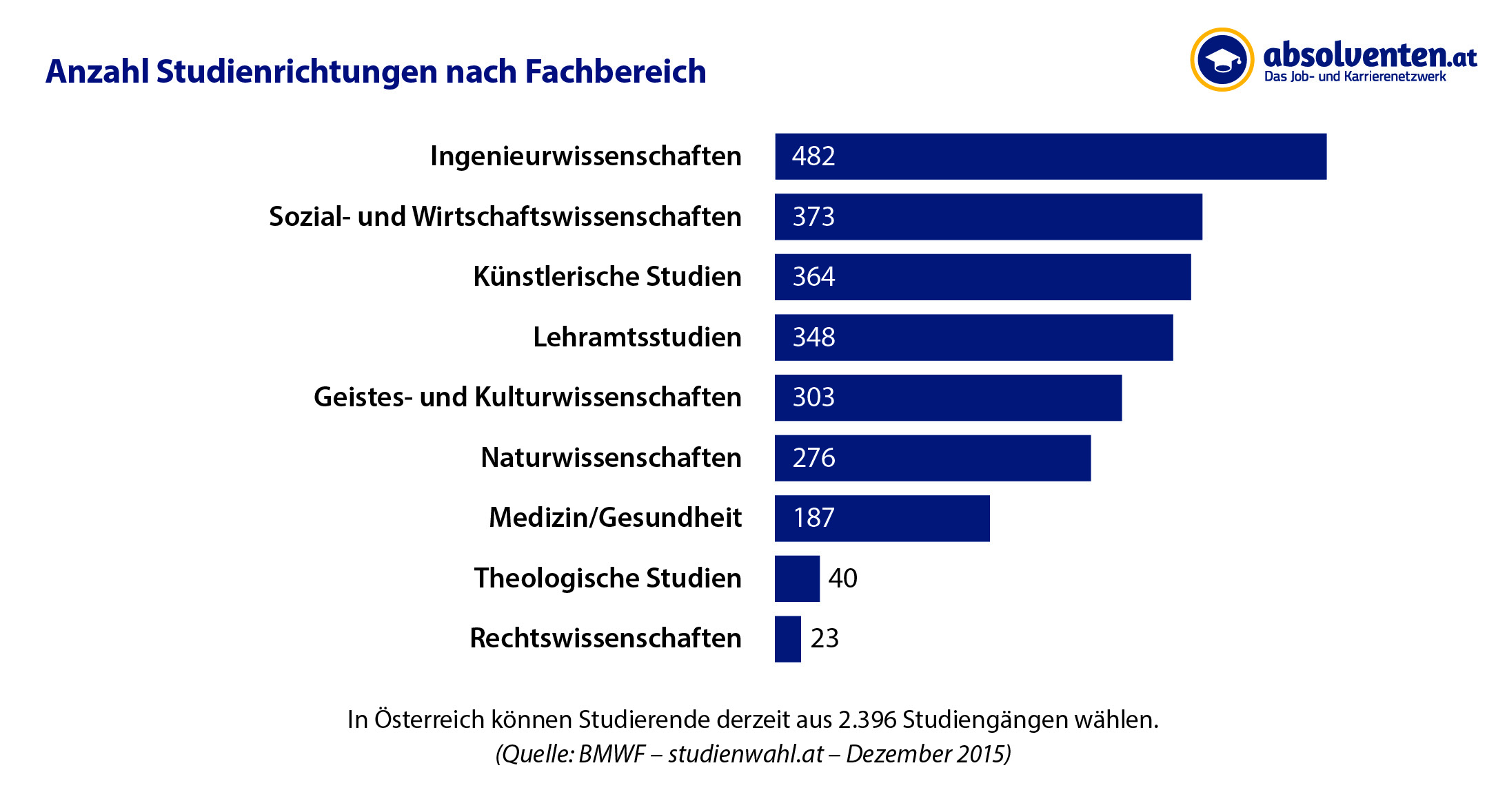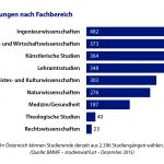 Studieninteressierte in Österreich haben die Qual der Wahl: Derzeit können Sie aus insgesamt 2.396 Studiengängen wählen. Davon werden 482 – und damit die meisten – in den Ingenieurswissenschaften angeboten. Auf Rang zwei folgen die Sozial- und Wirtschaftswissenschaften mit 373 Studiengängen noch vor den künstlerischen Studien mit 187 offerierten Bachelor- und Master-Programmen.
