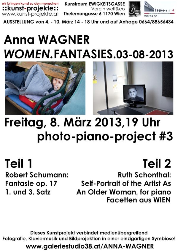 Anna Wagner zeigt von 4. bis 10. März im Kunstraum Ewigkeitsgasse in Wien-Hernals, im Haus des in New York lebenden Schriftstellers Frederic Morton, neue Fotoarbeiten unter dem Motto „Frauen und Fantasien“. Bei der Präsentation am 8. März – im Rahmen des Internationalen Frauentages – spielt sie Klaviermusik von Robert Schumann und Ruth Schonthal, begleitet von einer Projektion ihrer Bilder. Die Herausforderung besteht darin, durch den Medienwechsel verschiedener Ausdrucksformen wie Bildsprache (visuell und „asynchron“ zur Musik) und Musik (auditiv) die Phantasie der Rezipienten anzuregen und ihnen neue Zugänge im Sinne von „Inside-Outside“-Erfahrungen zu erschließen.