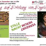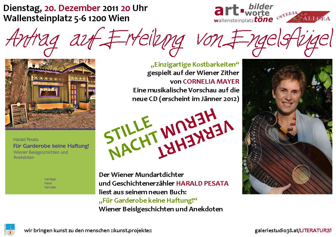 Zum Abschluss der ersten Saison findet am 20. Dezember in Wien Brigittenau im Rahmen der Reihe „bilder.worte.töne“ ein musikalisch-literarischer Abend unter der Überschrift „Antrag auf Erteilung von Engelsflügel“ statt. Er soll auch, aber nicht nur, auf das bevorstehende Weihnachtsfest und den Jahreswechsel einstimmen. Dass die Zeit vor der „Stillen Nacht“ doch nicht ganz still sein muss, und neben Besinnlichem auch Humor und Unterhaltung darin Platz haben, dafür werden die Zithervirtuosin Cornelia Mayer und der Wiener Mundartdichter Harald Pesata an diesem Abend sorgen.