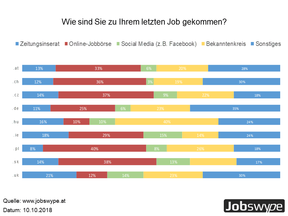 An zweiter Stelle landet der Bekanntenkreis, der offensichtlich auch recht oft zur Findung eines neuen Arbeitsplatzes genutzt wird. Österreicher liegen hier mit 20 Prozent im europäischen Durchschnitt, einen deutlichen Ausreißer nach oben verzeichnet hingegen Ungarn, wo satte 40 Prozent ihre neue Stelle durch die Hilfe des Bekanntenkreises finden. Soziale Netzwerke sind langsam im Kommen, jedoch landen sie an letzter Stelle, mit Werten zwischen 3 Prozent (Schweiz) und 15 Prozent (Irland), aber nur knapp hinter den klassischen Printmedien, die sehr ähnliche Ergebnisse einfahren. Lediglich im Vereinigten Königreich kommen noch respektable 21 Prozent der Umfrageteilnehmer durch Zeitungsannoncen zum neuen Job.
