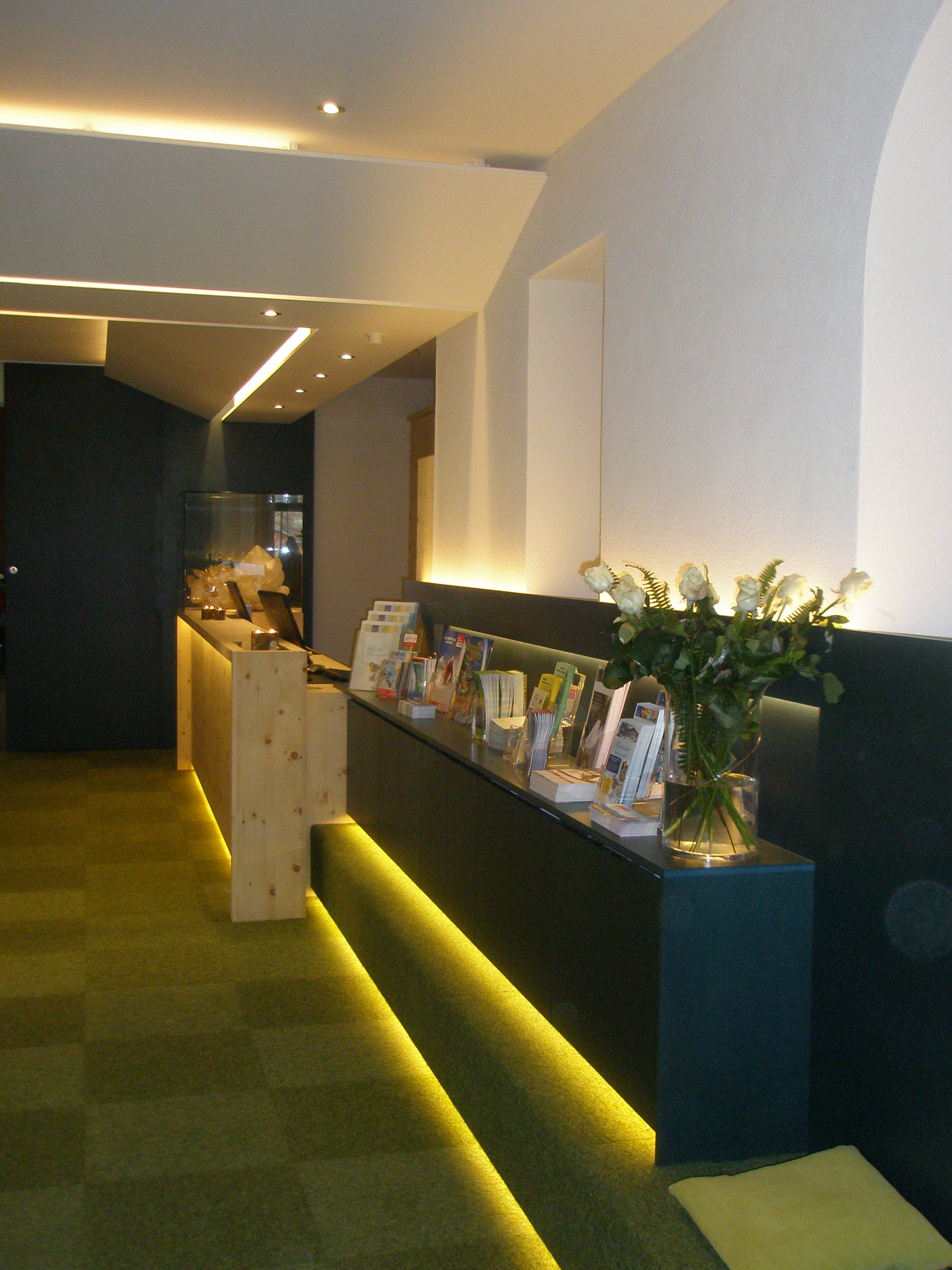 Der Empfangsbereich ist nun warm, herzlich und offen. Das Herzstück des Hauses erstrahlt im neuen Glanz. Dabei wurde viel Zirbenholz verarbeitet. Das gibt dem Ganzen eine besondere Wärme.