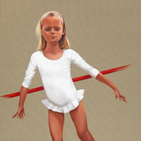 Traute Molik-Riemer präsentiert vier Skizzen, die im Tanzquartier entstanden sind. Das Ölbild von einer kleinen Ballettelevin enthält das Wort Pisa – einerseits in Anspielung auf den schiefen Turm, andererseits auf die Pisa-Studie bei SchülerInnen. Das Bild ist mit feinem Tüll überzogen und auf dem gemalten Tüllrock ist ein echter etwas längerer Tüllrock appliziert.