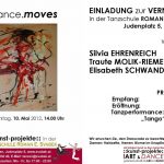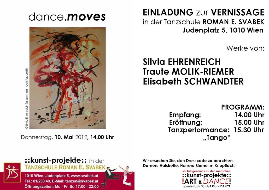 Am 10. Mai wird die zweite Gruppenausstellung in der Tanzschule Svabek eröffnet. Die Studien und Gemälde von Silvia Ehrenreich, Traute Molik-Riemer und Elisabeth Schwandter thematisieren unter dem Titel „dance.moves“ den Aspekt der Bewegung beim Tanz.