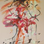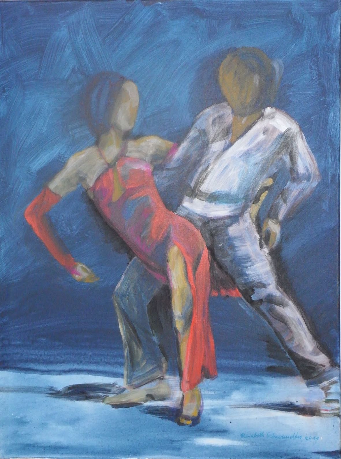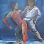 Silvia Ehrenreich hat ihre Serie „moving“ als aquarellierte Tuschezeichnungen gestaltet. Die einzelnen Figuren und Paare sind mit schwungvollem und lockerem Strich auf das Papier gesetzt, sodass die Leichtigkeit der Bewegung unmittelbar zum Tragen kommt. Auch das großformatige Leinwandbild „Tanz mit mir nach Pavarotti“, das Einladungsmotiv der Ausstellung, folgt diesem Duktus.