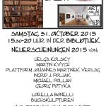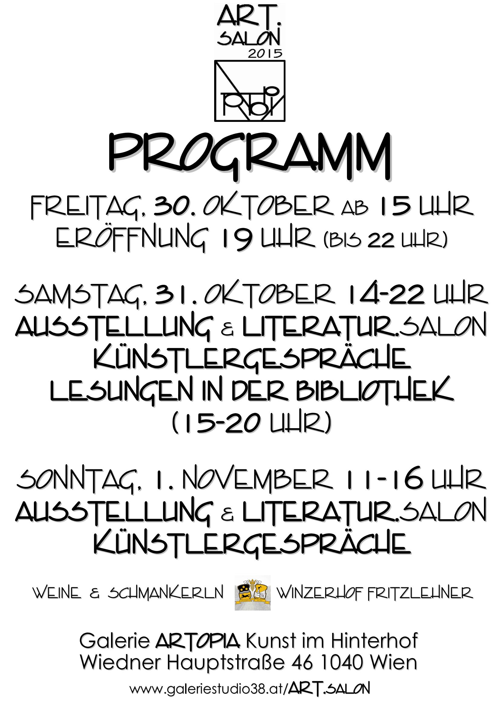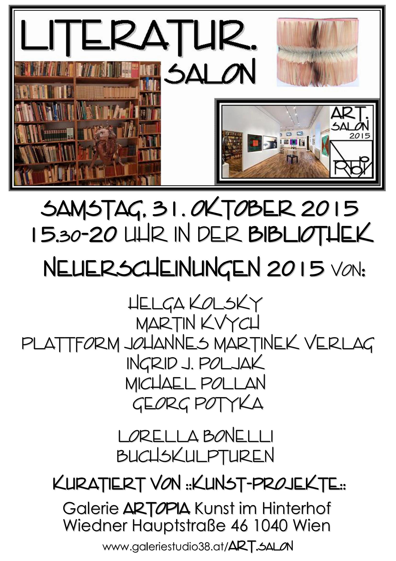 30., 31. Oktober, 1. November 2015 ART.SALON 2015 – Kunst & Literatur Galerie ARTOPIA (Kunst im Hinterhof) Wiedner Hauptstraße 46, 1040 Wien kuratiert von ::KUNST-PROJEKTE::