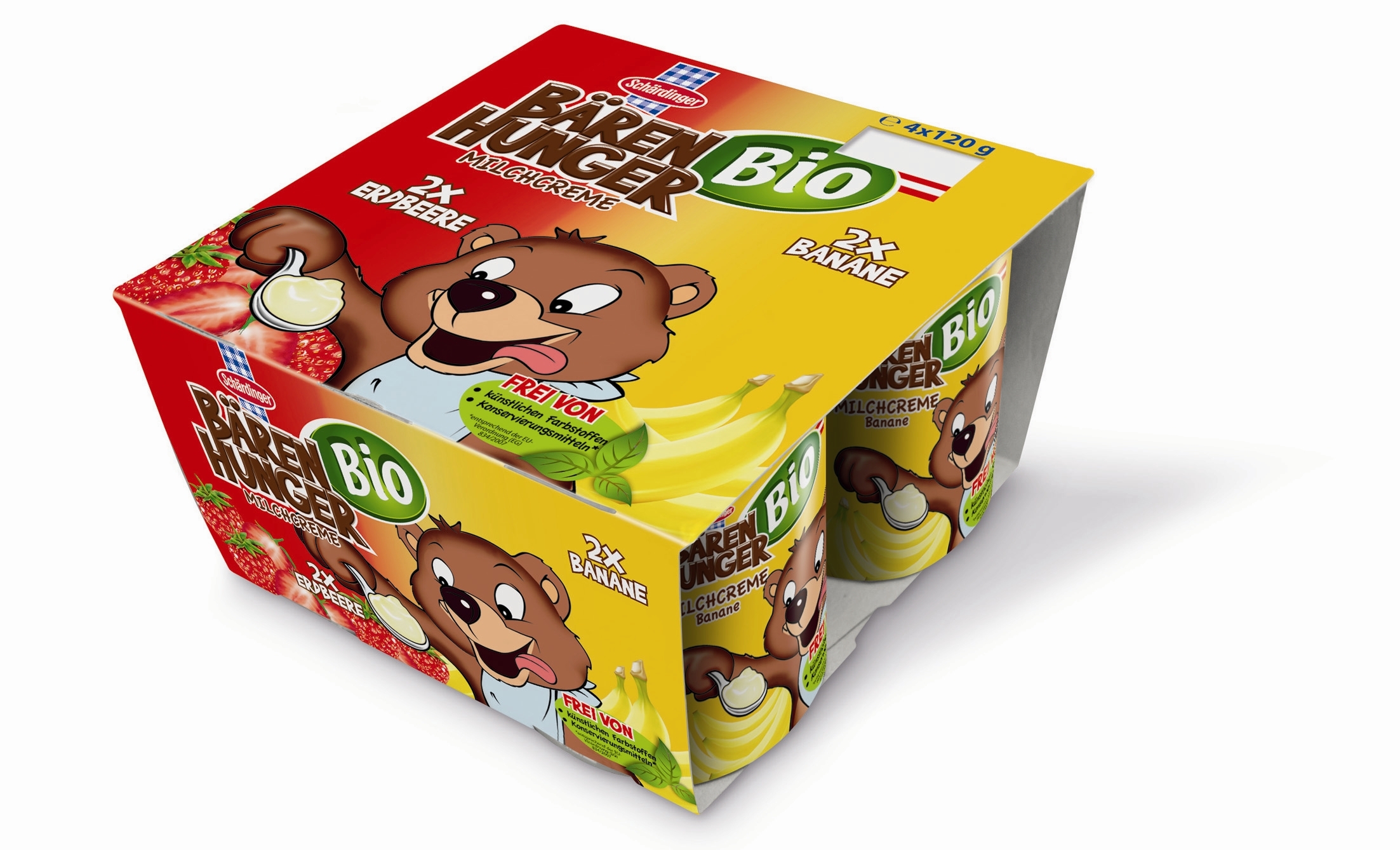 Die neue Schärdinger Bärenhunger Milchcreme Erdbeere/Banane ist ab Anfang Juni 2011 im praktischen 4er-Multipack je zwei Sorten à 120 g im Handel erhältlich. Durch die bunt gestaltete Verpackung mit dem Bären und die Malvorlage auf der Rückseite des Kartons ist die neue Bärenhunger Milchcreme der Hit für coole Kids im Kühlregal.