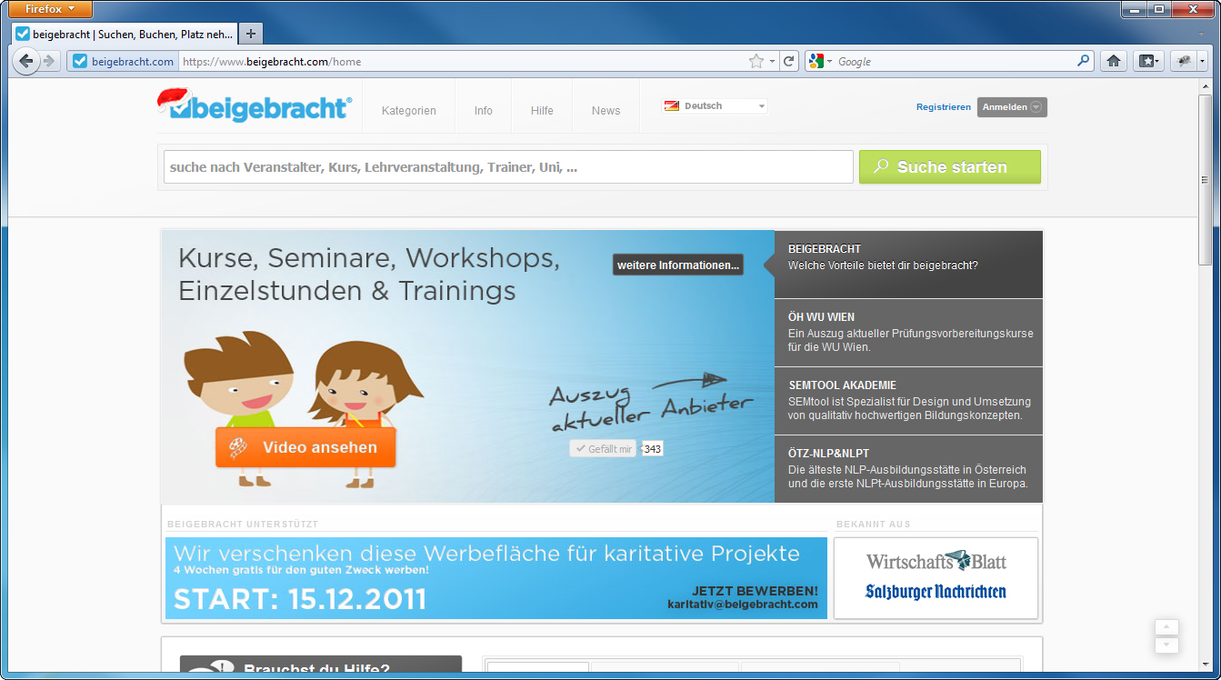 Wien, 06. Dezember 2011: In der besinnlichen Weihnachtszeit sollte an wirklich wichtigen Dingen festgehalten werden. Viel zu oft steht der Konsumzwang im Fokus der weihnachtlichen Festtage. Aus gegebenem Anlass verschenken die Jungunternehmer von beigebracht.com einen Monat lang Werbeflächen an karitative Projekte, im Wert von rund 3000 Euro.
