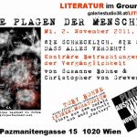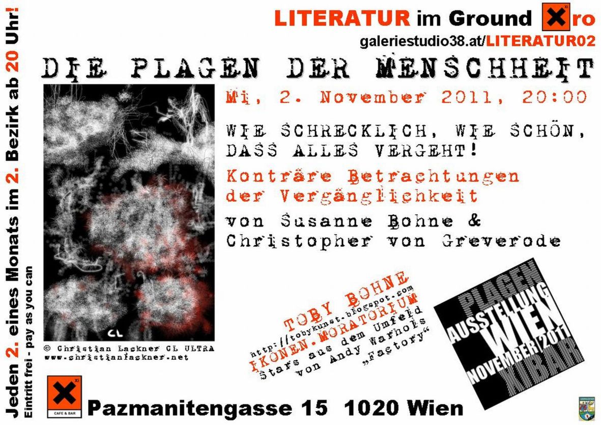 Die Lesereihe „Die Plagen der Menschheit“, die nach den „7 Todsünden“ im Juni dieses Jahres erfolgreich gestartet wurde, wird am 2. November im Gewölbekeller „Ground Xiro“ der Xi Bar mit der Autorin Susanne Bohne aus Dortmund und dem ebenfalls aus Deutschland stammenden, in Wien lebenden Literaten Christopher von Greverode fortgesetzt.