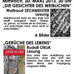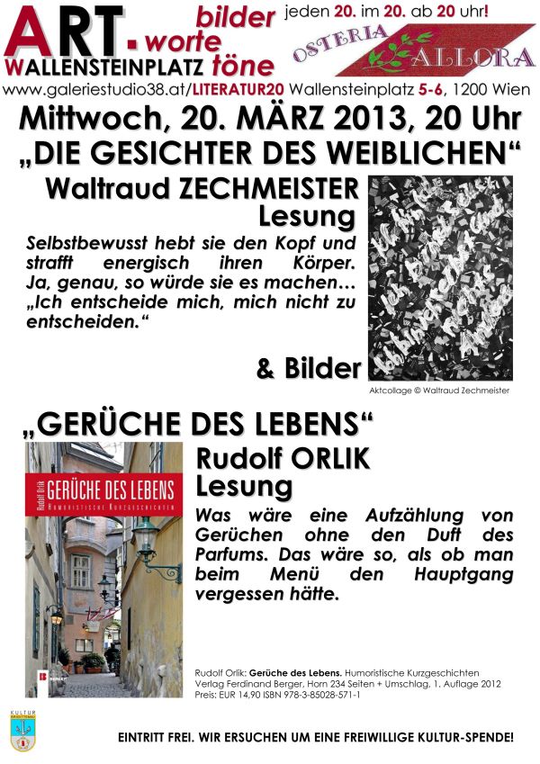 Am 20. März lesen Waltraud Zechmeister und Rudolf Orlik bei bilder.worte.töne. Waltraud Zechmeisters Prosatexte und Aktcollagen kreisen um Befindlichkeiten aus weiblicher Sicht. Rudolf Orlik liest humoristische Kurzgeschichten über Begegnungen mit Frauen ins einem im Verlag Berger erschienenen Erstlingswerk „Gerüche des Lebens“.