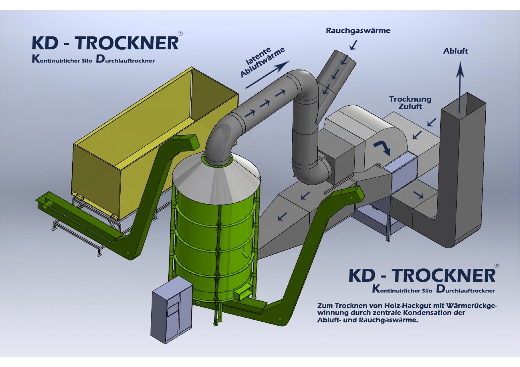 DerKD – Trockner mit Voll – Brennwert – Wärmerückgewinnung mit maximaler Energieeffizienz & Emissionsreduktion ist die Lösung für Biomasse Heiz- & Kraftwerke zur Heizwert- Wertsteigerung von Hackgut.