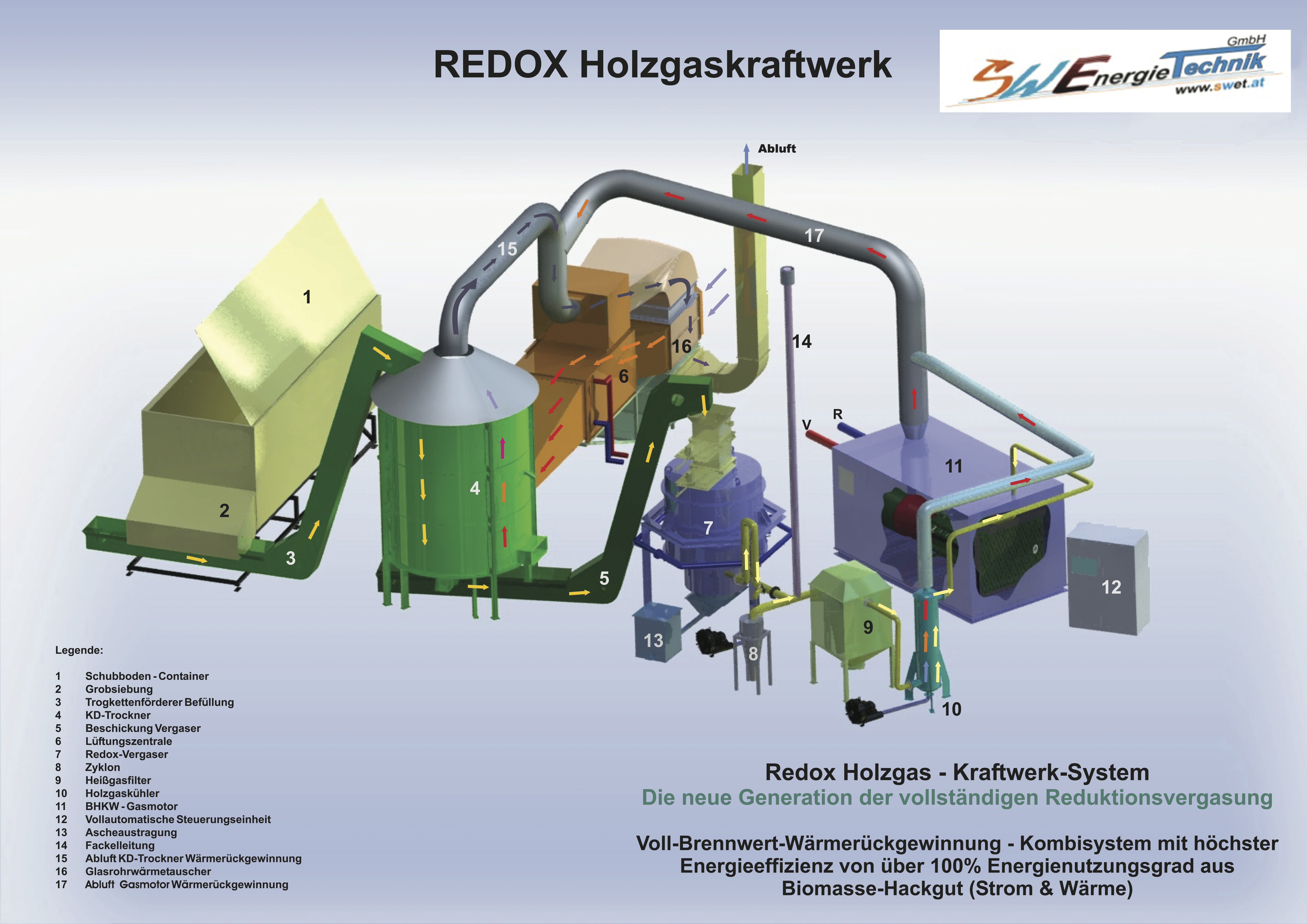 Zudem produziert das patentierte „REDOX – Holzgaskraftwerk mit dem integrierten KD – Trockner“ und der neuen Generation der 2 – stufigen REDOX-Gleichstrom-Reduktionsvergaser den gewinnbringenden Ökostrom ca. 220 KW el & Wärme ca. 400 KW th als bedeutenden Umweltbeitrag.