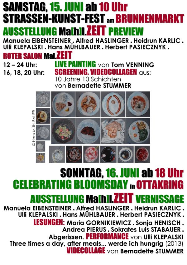 Dem Essen und Trinken und der Zeit ist der fünfte Bloomsdayin Ottakring gewidmet. Die beteiligten Künstlerinnen und Künstler – Manuela EIBENSTEINER, Alfred HASLINGER, Heidrun KARLIC, Ulli KLEPALSKI (Bilder und Performance), Hans MÜHLBAUER, Herbert PASIECZNYK und Tom VENNING (Live Painting) -, Autorinnen und Autoren – Maria GORNIKIEWICZ, Sonja HENISCH, Andrea PIERUS und Sokrates Luis STABAUER – und die Filmemacherin Bernadette STUMMER nähern sich in ihren Werken und Texten dem Thema „Ma[h]l.ZEIT bei ULYSSES“ aus ganz verschiedenen Blickwinkeln.