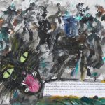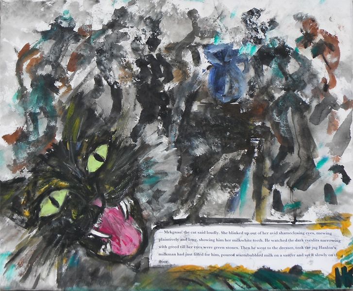 Heidrun KARLIC lässt die Katze, die von Bloom im Kapitel„Calypso“ mit einer Schüssel Milch versorgt wird und diese mit genüsslichem Schmatzen verzehrt, auf ihrem Leinwandbild lebendig werden und versieht es mit dem dazu gehörenden lautmalerischen Textzitat.