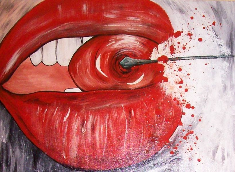 Manuela EIBENSTEINER stellt in „Fruchtmord“ den Genuss des Augenblicks, den Moment der Vergänglichkeit anhand eines riesigen Mundes, der gerade eine kirschenartige Frucht verzehrt, dar.