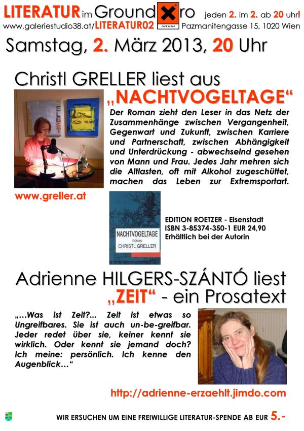 Die mehrfach preisgekrönte Autorin und Lyrikerin Christl Greller lesen Ausschnitte aus ihrem Roman „Nachtvogeltage“ und die „schreibende Biologin“ Adrienne Hilgers Szántó einen Prosatext über die Zeit. Samstag, 2. März 2013, 20 Uhr Xi CAFE & BAR, Pazmanitengasse 15, 1020 Wien Wir ersuchen um eine freiwillige Literaturspende ab EUR 5.-