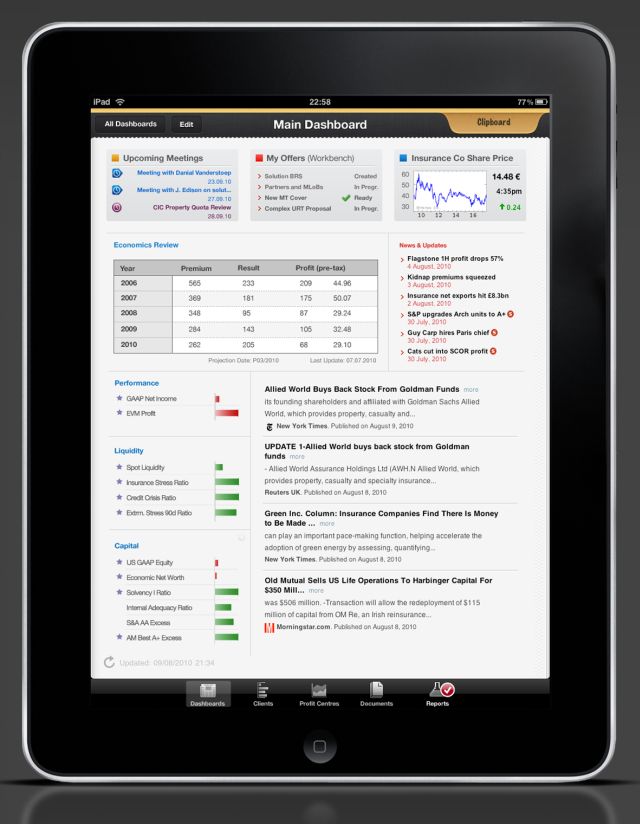 Com Tec Co, ein Unternehmen, das mobile Apps für Unternehmen entwickelt, unterstützte den führenden Rückversicherer Swiss Re dabei, seinem Top-Management eine Dashboard-App für iPad und iPhone zur Verfügung zu stellen. Die App ermöglicht den Top-Managern von Swiss Re, an jedem Ort und zu jeder Zeit den Zugang zu entscheidenden Führungsinformationen.