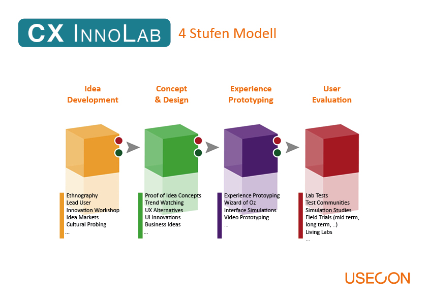 Das Customer Experience Innovation Lab ist eine geprüfte Methodik, um benutzerzentrierte Innovationen zu generieren und Business Opportunitäten aufzudecken. Manfred Tscheligi, Managing Director bei USECON (www.usecon.com), dem österreichischen Marktführer im Bereich Usability und Customer Experience, fasst den zentralen Vorteil des Customer Experience Innovation Labs zusammen: „Vier Phasen führen in kurzer Zeit von der Ideenfindung zu einem „greifbaren“, evaluierten Prototypen und ermöglichen somit eine rasche Umsetzung und einen schnellen Markteintritt. Durch die stetige Einbindung von Kunden bzw. Benutzern, können wir optimal auf deren Bedürfnisse eingehen und diese während des Prozesses umsetzen.“ Das CX Inno Lab wurde bereits in den unterschiedlichsten Branchen angewendet und stellt einen wichtigen Meilensteinim Innovationsmanagement dar.