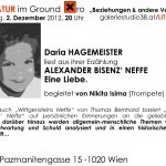 Am 2. Dezember liest die Autorin Daria Hagemeister im Ground Xiro erstmals aus ihrer noch unveröffentlichten autobiographischen Erzählung „Alexander Bisenz’ Neffe“, die so wie auch „Wittgensteins Neffe“ von Thomas Bernhard auf persönlichen Erinnerungen an die geliebte Person basiert. Doch darüber hinaus werden von der Autorin allgemein-menschliche Themen wie Liebe, Verantwortung und Schuld analysiert undin einen historischen Kontext gestellt.