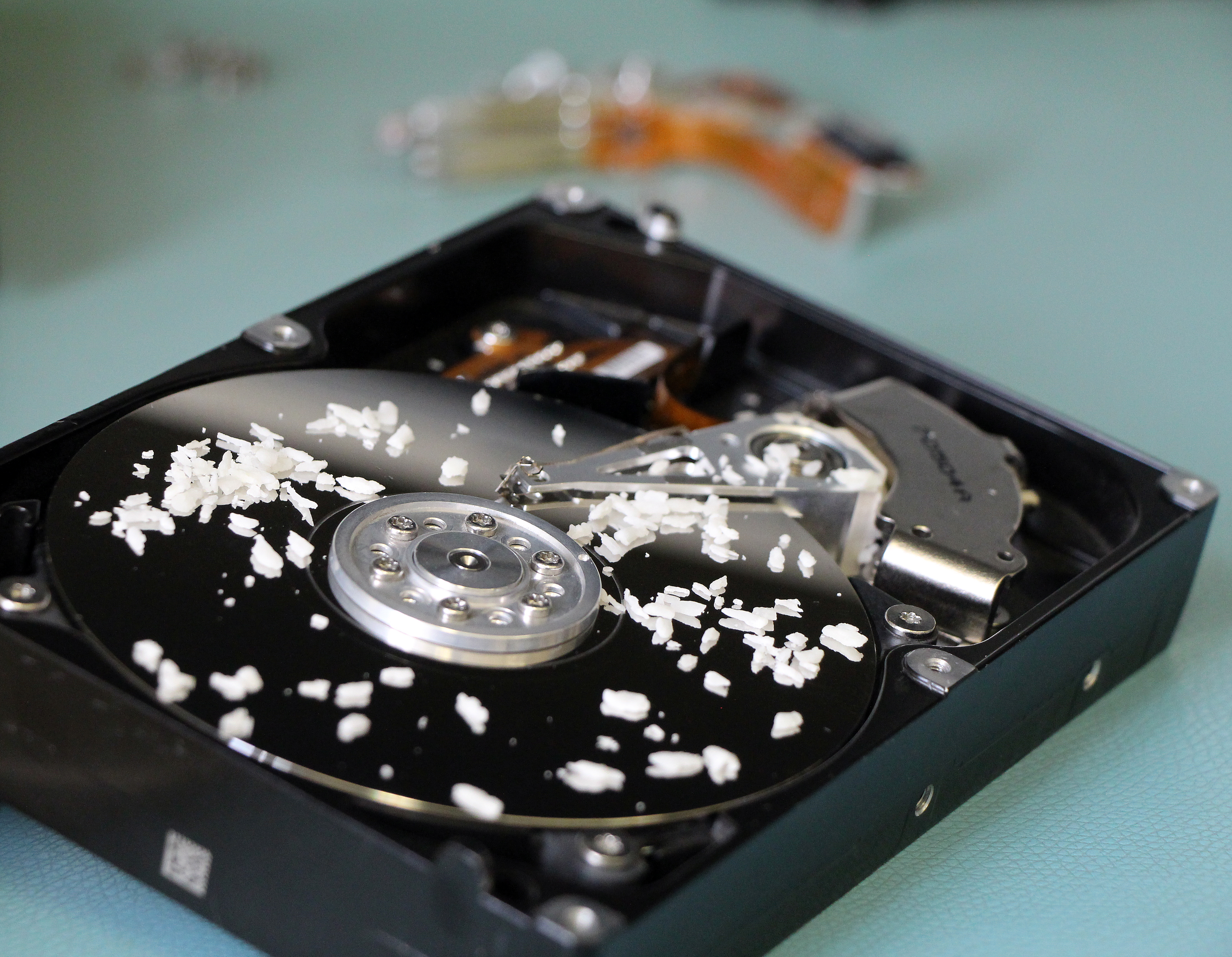 Per Post erreichte uns ohne Vorankündigung eine Festplatte, zum Glück mit einer Telefonnummer auf einem Stück Zeitungspapier. Wir bemerkten sofort das gebrochene Siegel auf der Festplatte und kontaktierten den Kunden, was denn mit dem Datenträger passiert sei. „Die Festplatte ist runtergefallen, und ich habe dann auf meinem ganz sauberen Schreibtisch nur kurz hineingeschaut, ob der Armhängen geblieben ist“, meinte der Kunde. Die Diagnose im Reinraum ergab jedoch, dasseigenartige, weiße Flöckchen im Inneren der Platte verteilt waren: Kokosraspeln.