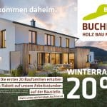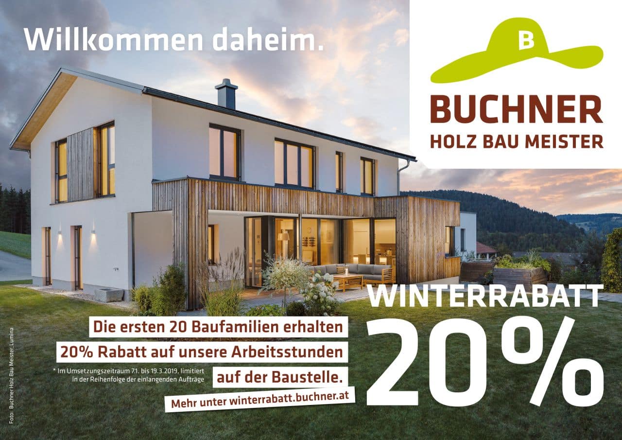 Damit Baufamilien den Winter nutzen und im Sommer bereits gemütlich wohnen können, hält Buchner einen Winterrabatt für das neue Haus, das neue Stockwerk oder den Zubau – von Carport bis Wintergarten – bereit. 20 Baufamilien, die im Zeitraum von 7. Jänner bis 19. März (Josefitag) ihr Buchner-Projekt umsetzen, dürfen sich über eine Ermäßigung von 20 Prozent auf alle Buchner-Arbeitsstunden auf der Baustelle freuen. Dieses Angebot gilt sowohl für die Montagearbeiten als auch für den Innenausbau.