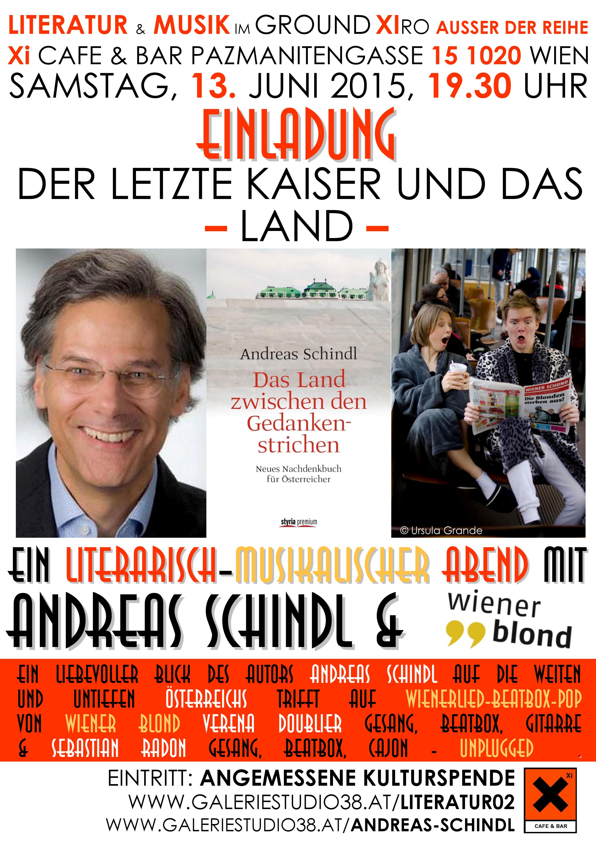 Am 13. Juni liest Andreas Schindlaus seinem Essayband „Das Land zwischen den Gedankenstrichen. Neues Nachdenkbuch für Österreicher“ im „Ground Xiro“ des Szenelokals Xi CAFE & BAR.Musikalisch begleitet wird er dabei vom Duo WIENER BLOND und ihrem teilweiseschrägen Wienerlied-Beatbox-Pop.