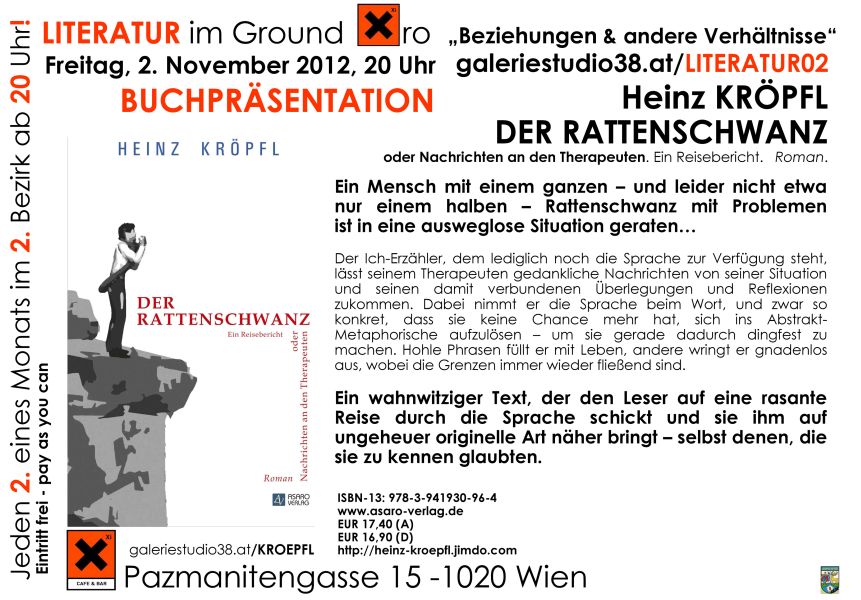 Der bekannte steirische Autor Heinz Kröpfl stellt seinen neu erschienenen Roman „Der Rattenschwanz“ im Rahmen seiner Lesetour auch bei zwei vom Verein kunst-projekte organisierten Veranstaltungen vor!
