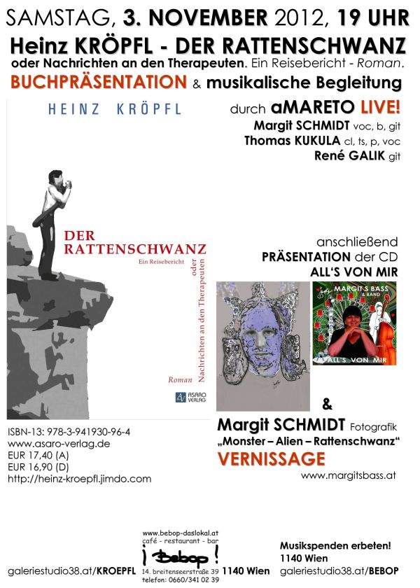 Am 2. November liest er im „Ground Xiro“ in der Leopoldstadt, am 3. November wird seine Lesung im Penzinger Szene-Lokal Bebop von Margit Schmidt und ihrer Band aMARETO musikalisch und bildnerisch (mit neuen Fotografiken zum Thema) begleitet.