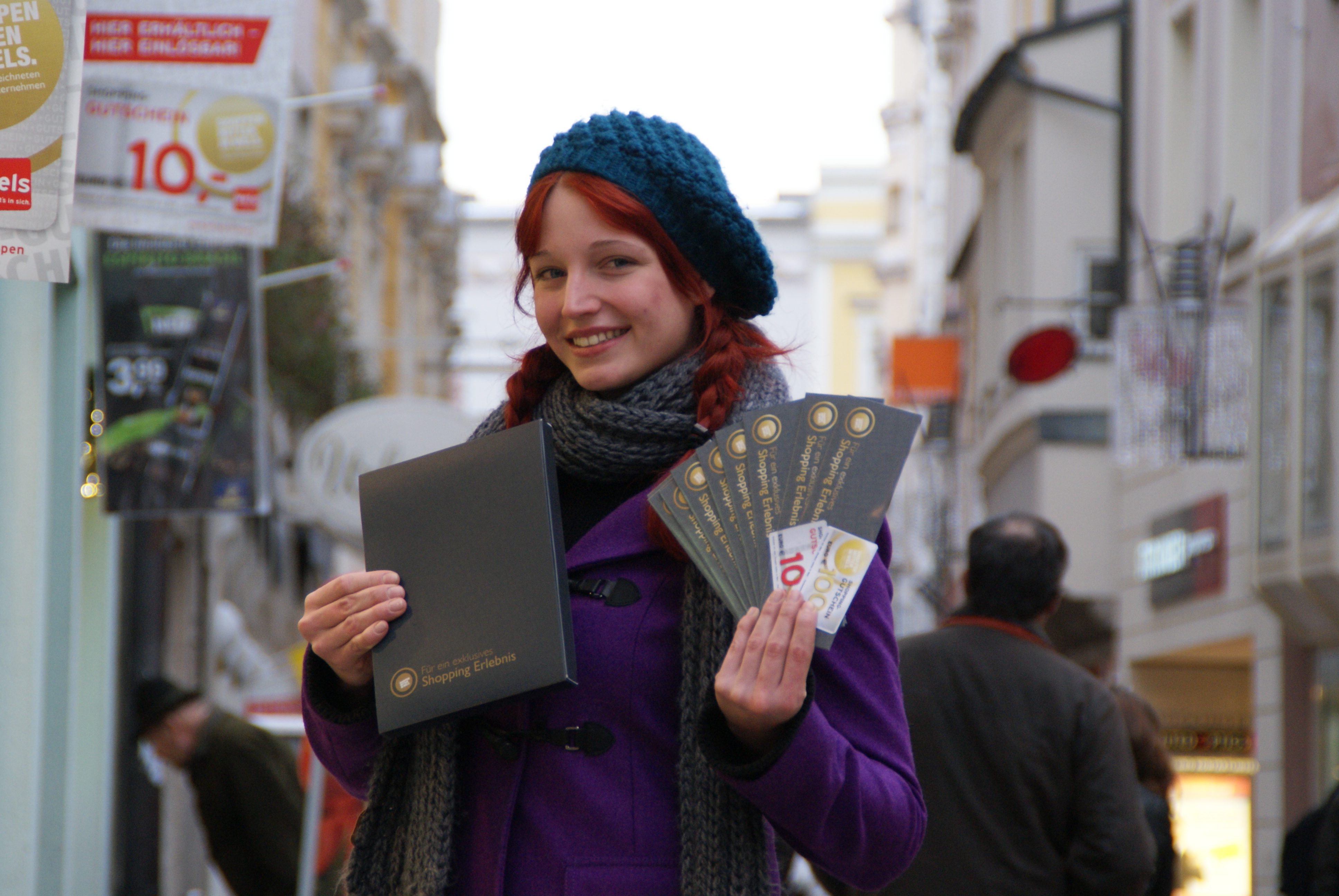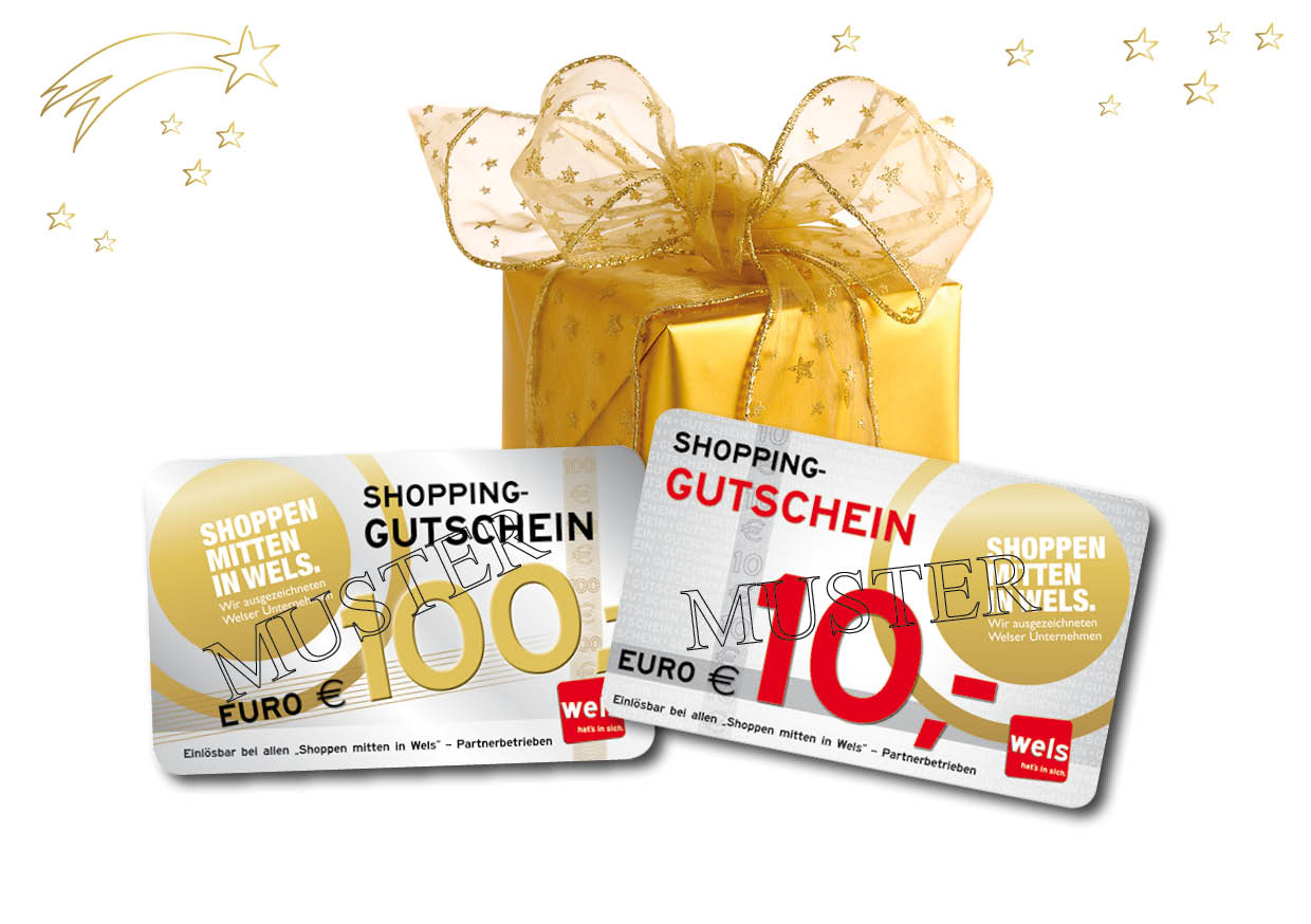 „Shoppen mitten in Wels“, kann man sich jetzt auch schenken lassen, denn „Shoppen mitten in Wels“ gibt´s im praktischen Scheckkartenformat, als 10 und 100 Euro-Gutschein! Wer gerne einkaufen geht, für den ist ein „Shoppen mitten in Wels“-Gutschein das ideale Geschenk. Warum? Weil der Gutschein die Eintrittskarte zu einem exklusiven Shoppingerlebnis in der Welser Innenstadt ist. Er lädt ein, im Zentrum der Messestadt einen Schaufensterbummel zu machen, die Geschäfte der City kennen zu lernen und in den rund 140 Partnerbetrieben von „Shoppen mitten in Wels“ nach Herzenslust einzukaufen. Und das geht ganz einfach, denn bei der riesigen Marken- und Sortimentsvielfalt in Wels macht Shoppen richtig Spaß! Schließlich warten Mode, Haushaltswaren, Bücher, Schmuck und Elektrogeräte ebenso darauf mit einem „Shoppen mitten in Wels“-Gutschein bezahlt zu werden, wie der frisch gebrühte Cappuccino und das Stück Torte beim gemütlichen Kaffeehaus-Besuch.