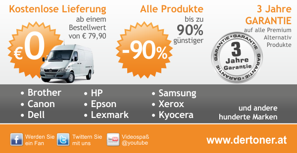 Ihr günstiger Tonershop - DerToner.at bietet Ihnen originale und kompatible Tintenpatronen, Druckerpatronen, Cartridges, Toner, Tinten, Bildtrommel und Druckerzubehör zum Top Preis-Leistungs-Verhältnis! Druckerzubehör für Ihren Drucker gleich online auf dertoner.at bestellen und günstiger drucken!