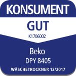 Wien, 12. Jänner 2018 – 68 von möglichen 100 Punkten erhielt der Beko Trockner DPY 8405 HW3 und damit die Testnote „Gut“ im Testmagazin „Konsument“ in der Ausgabe 12/2017. Das vom österreichischen Verein für Konsumenteninformation herausgegebene Testmagazin bewertete verschiedene Wärmepumpentrockner.