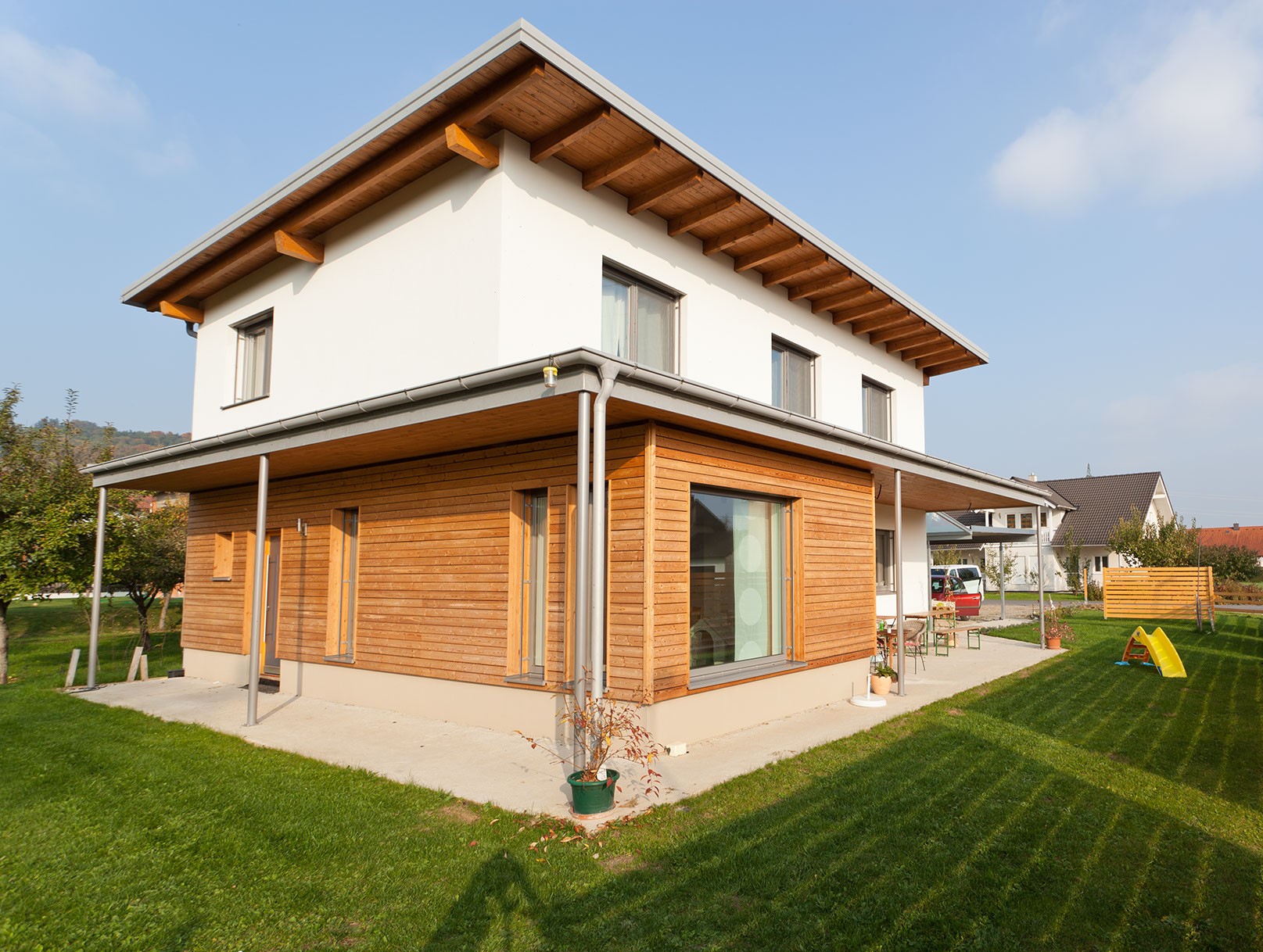 Ein praktischer Dachvorsprung sollte zumindest 30, besser aber 50 Zentimeter auskragen – auch bis zu 1,5 Meter sind durchaus sinnvoll; vor allem dann, wenn ein vorgestellter Balkon damit geschützt werden soll. Neben den Schutzfunktionen bietet der Dachvorsprung noch nützlichen „Trockenplatz“fürs Kaminholz oder das darunter abgestellte Fahrrad und das Dach verfügt übermehr Fläche für die Solaranlage.