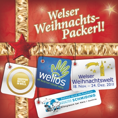 Rechtzeitig vor Weihnachten hat die Wels Marketing & Touristik ein spannendes und unterhaltsames Päckchen geschnürt, das obendrein noch preislich sehr attraktiv ist! Um nur 18,50 Euro statt 37 Euro bekommt man mit dem Welser Weihnachtspackerl einen Tageseintritt im Aquazoo Schmiding, einen Tageseintritt im Welios, einen zehn Euro Einkaufsgutschein „Shoppen mitten in Wels“ und ein Heißgetränk bei der Welser Weihnachtswelt.
