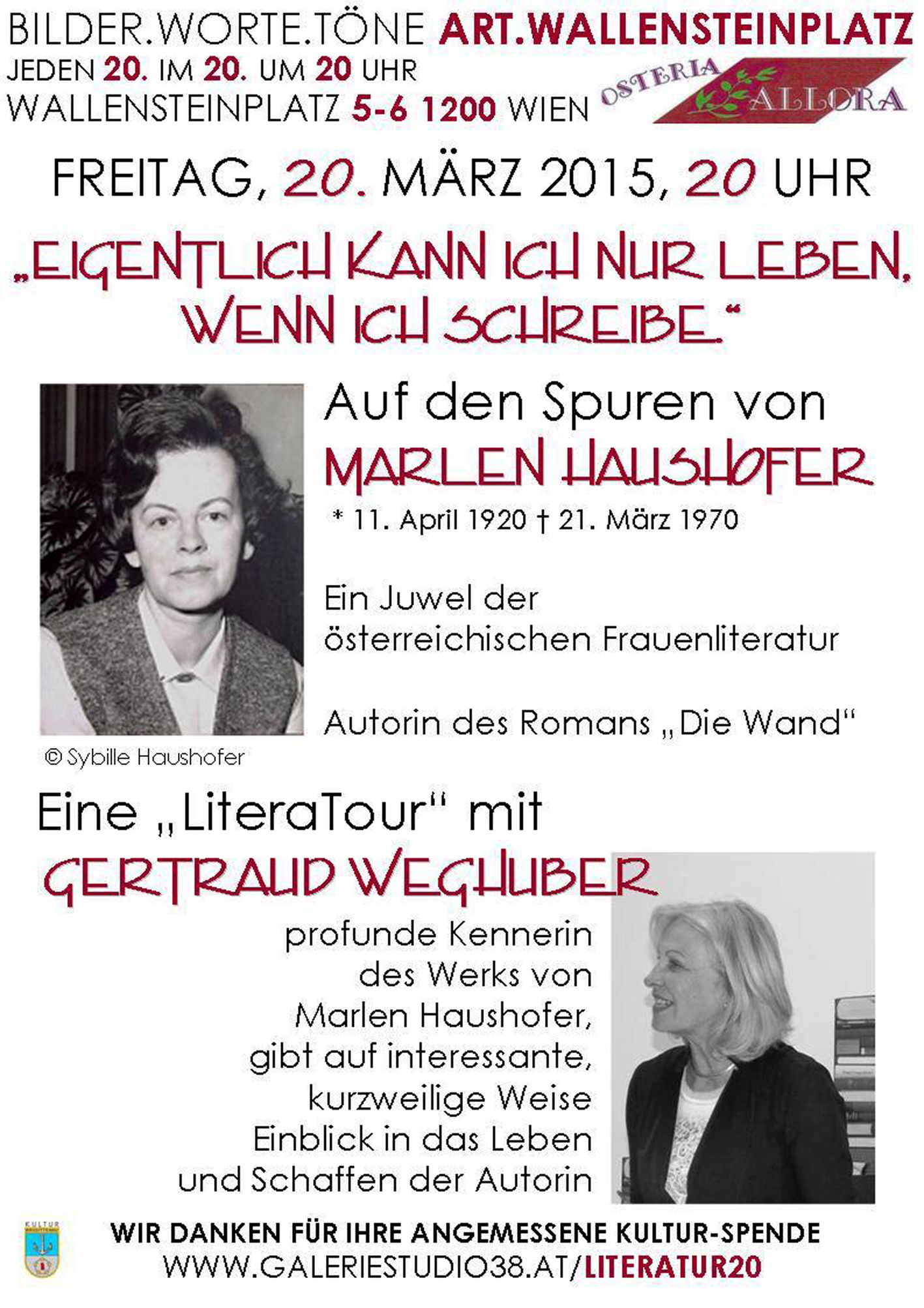 Freitag, 20. März 2015, 20 Uhr ART.WALLENSTEINPLATZ Wallensteinplatz 5-6, 1200 Wien EIGENTLICH KANN ICH NUR LEBEN, WENN ICH SCHREIBE Auf den Spuren von Marlen Haushofer (anlässlich ihres 45. Todestages) eine „LiteraTour“ mit Gertraud Weghuber Evelyn Doll – Malerei & Zeichnungen Vernissage ab 19 Uhr Ausstellung bis Mitte April 2015