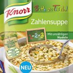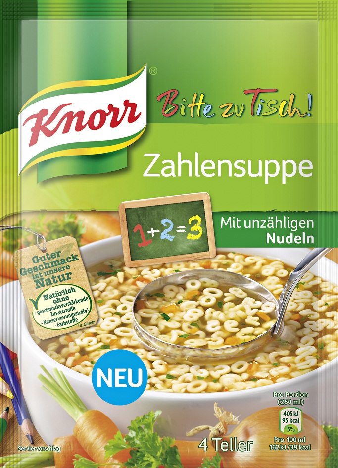 Die Produktneuheit KNORR Bitte zu Tisch! Zahlensuppe richtet sich an Rechentalente und an alle, die es noch werden wollen. Mit unzähligen Nudeln kommt ab sofort am Esstisch keine Langeweile mehr auf. Jede Mahlzeit wird zu einem spannenden Zahlenerlebnis, das nicht nur die körperlichen Kräfte stärkt, sondern auch spielerisch auf die nächste Mathematikstunde vorbereitet. Die klare, mild gewürzte Bouillon mit unzähligen Nudeln schmeckt Rechengenies jeder Altersgruppe.