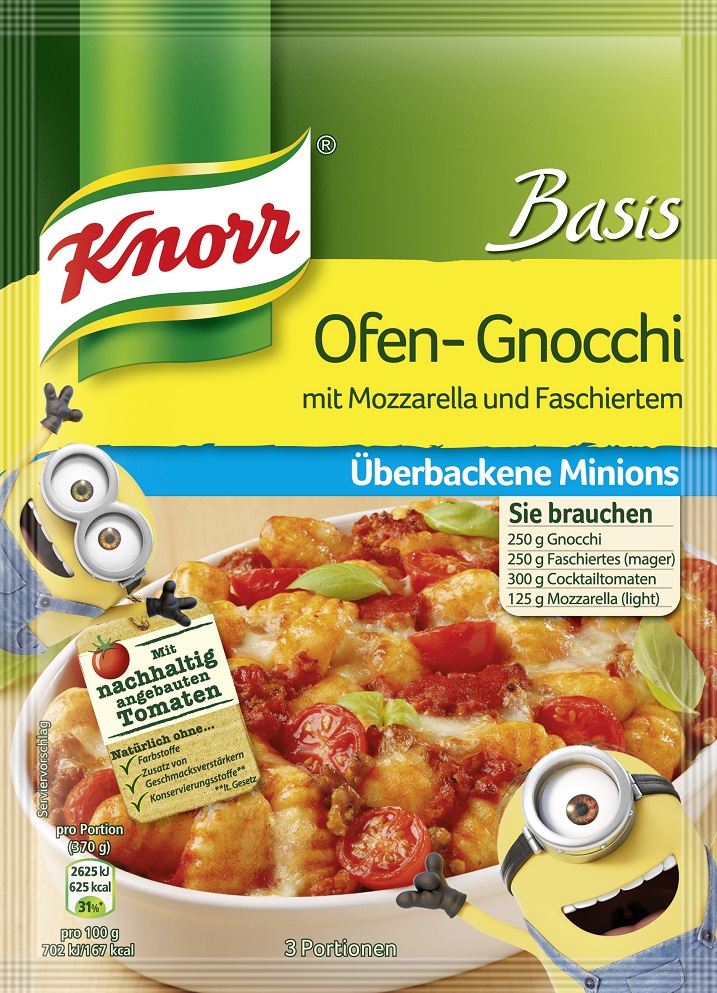 Die KNORR Basis für Ofen-Gnocchi mit Mozzarella im coolen Minions-Look überzeugt große und kleine Hobbyköche gleichermaßen. Durch das Hinzufügen von frischen Zutaten wie Cocktailtomaten wird der Geschmack der „Überbackenen Minions“ noch aromatischer. Die kleinen, gelben Chaos-Helden aus dem „Ich – Einfach unverbesserlich“-Universum sind Kult und werden im Sommer 2015 Stars ihres eigenen Kinofilmes. Um bis dahin nicht ohne geliebte Minions auskommen zu müssen, liefert KNORR mit den Ofen-Gnocchi mit Mozzarella schon jetzt einen idealen Vorgeschmack.