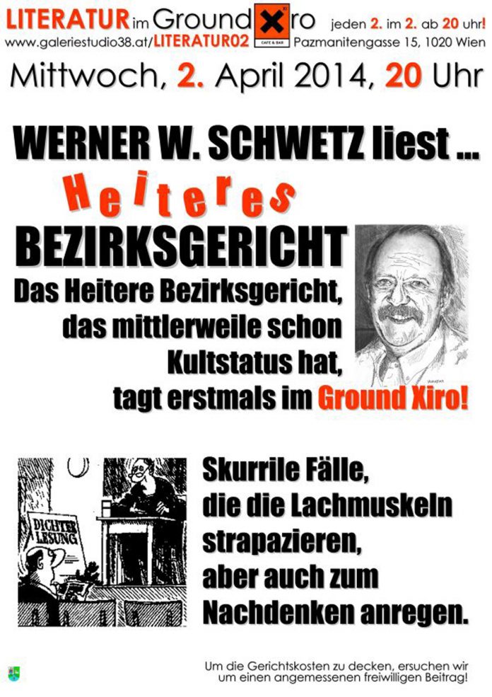 Werner W. SCHWETZ liest… HEITERES BEZIRKSGERICHT Mittwoch, 2. April 2014, 20 Uhr Xi CAFE & BAR, Pazmanitengasse 15, 1020 Wien