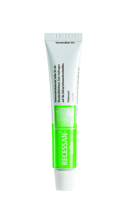 Der Wirkstoff in RECESSAN, Polidocanol, beseitigt als schnell wirkendes Lokalanästhetikum sofort den Schmerz und wirkt lang anhaltend. Durch die gute Hafteigenschaft der Salbe wird ein optimaler therapeutischer Effekt erzielt. Zusätzlich gibt RECESSAN perfekten Halt und bei Vollprothesen bleibt das zusätzliche Auftragen einer Haftcreme erspart.