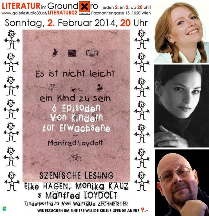 „Es ist nicht leicht ein Kind zu sein“ wird am 2. Februar im Ground Xiro in szenischer Lesung von den Schauspielerinnen Elke Hagen und Monika Kauz und dem Schauspieler Manfred Loydolt aufgeführt. Er ist auch Auto rund Regisseur des Stückes. Begleitend dazu zeigt Waltraud Zechmeister Portraits von Kindern.