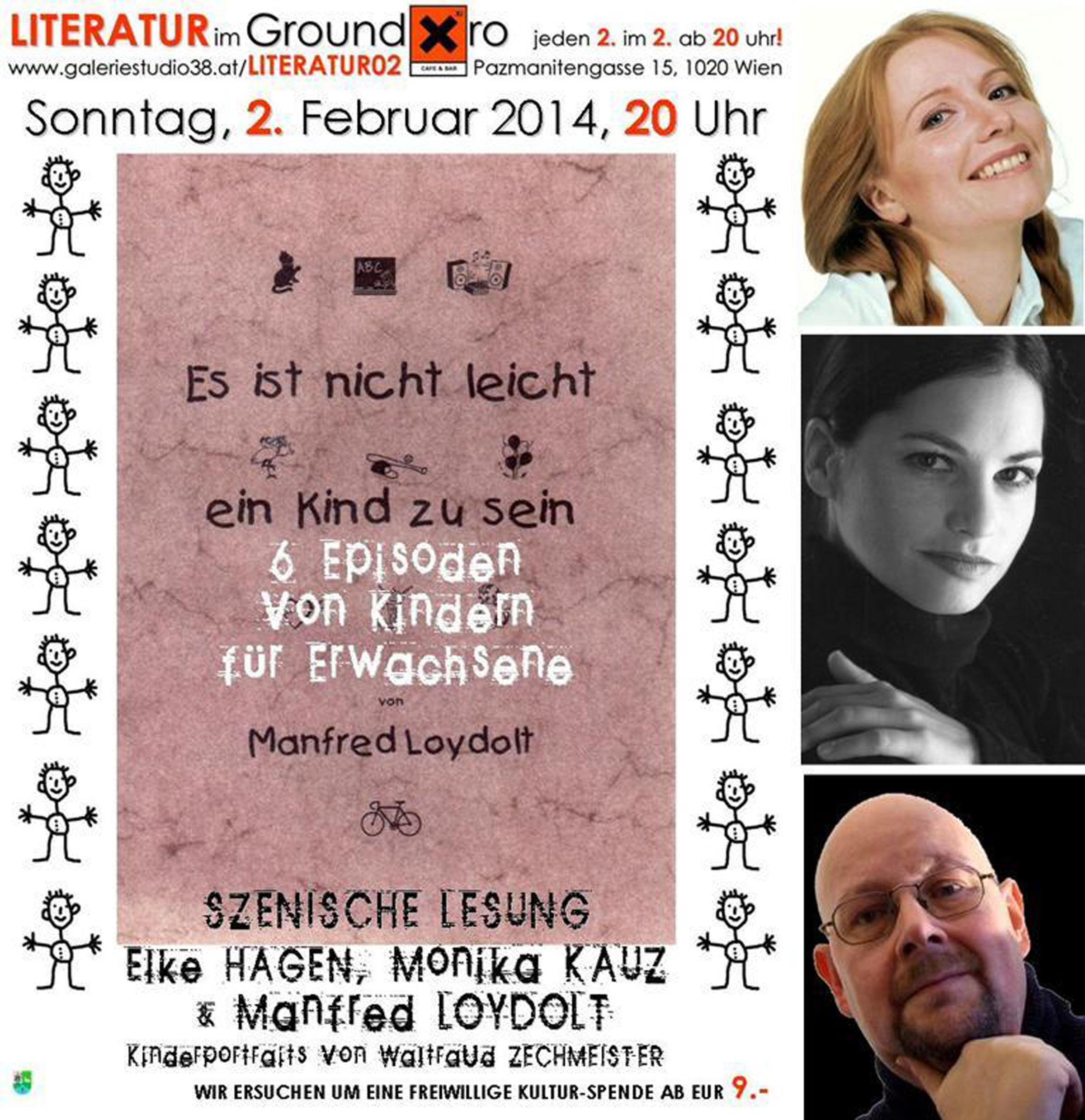 Szenische Lesung mit Elke HAGEN, Monika KAUZ und Manfred LOYDOLT Waltraud ZECHMEISTER präsentiert Kinderportraits. Sonntag, 2. FEBRUAR 2014, 20 Uhr Xi CAFE & BAR, Pazmanitengasse 15, 1020 Wien.