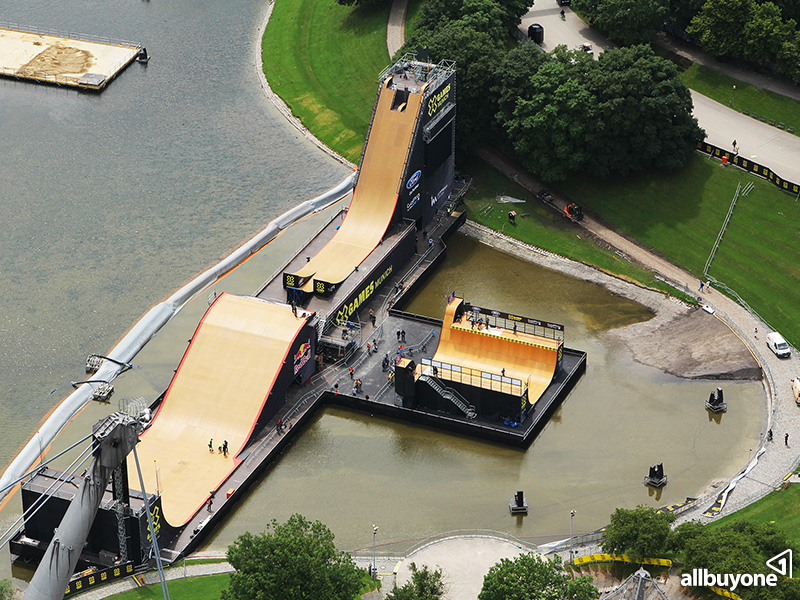 Der Veranstalter der X Games München, die Olympiapark München GmbH, vertraute für die Premiere ganz auf das Know-How und das besondere Produktsortiment des Eventausstatters allbuyone. Besonderer Hingucker der Games war das 130 m lange und über 20 m hohe Werbenetz inklusive passgenauer Durchgänge und Schrägen als eindrucksvolle Verkleidung der Big Air Rampe mitten im Olympiasee. Auch für die Tribünen der Ford RallyCross Challenge fertigte allbuyone eine 130 m lange und 8 m hohe Verkleidung an sowie unzählige maßgeschneiderte Banner für Kicker, Rampen und Start- bzw. Zielbögen beim Slopestyle Mountainbike Parcours. Über 5 km bedrucktes Endlosvlies wurden um das ganze Eventgelände herum auf Bauzäunen und Absperrgittern als Sichtschutz angebracht. Insgesamt produzierte allbuyone für die X Games über 12.000 m² Werbebanner und Werbenetze innerhalb weniger Tage. 80 Hissfahnen, 600 m² bedruckte Infoschilder und 2000 lfm Absperrband rückten das schwarz-gelbe Veranstaltungslogo im gesamten Olympiapark ins Blickfeld von Fans und Athleten. Zum Schutz vor Regen und anderen Umwelteinflüssen wurden Teile des Olympiabergs und alle Rampen mit 11.000 m² schwarzer PE-Folie abgedeckt. Für die Siegerpodeste lieferte allbuyone bedruckte Aufkleber mit Scratchlaminat. Die Motocrossevents wurden mit insgesamt 150 Crashpads aus nicht-brennbarem Glasgewebe nach DIN 4102 A2 ausgestattet, um ein sicheres Rennen zu garantieren. Natürlich durften auch nützliche Basics wie bedruckte Warnwesten für die Crew oder mehr als 40.000 Kabelbinder bei einer Veranstaltung dieser Größe nicht fehlen.
