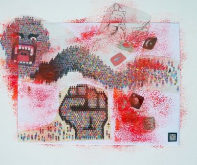 Heidrun KARLIC bezieht sich in ihrer Collage „verAPPelte Familie“ auf die aktuellen Herausforderungen an die Familien im Zeitalter der „Online-Gesellschaft“. Die Figuren bestehen teilweise aus „APPs“ und kristallisieren sich teilweise auch wieder heraus. Die Beantwortung der Frage, ob mehr oder weniger virtuelle Familienmitglieder eine Chance oder doch eher eine Gefahr für die körperliche bzw. genetische Familie darstellen, bleibt dem Betrachter überlassen.