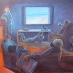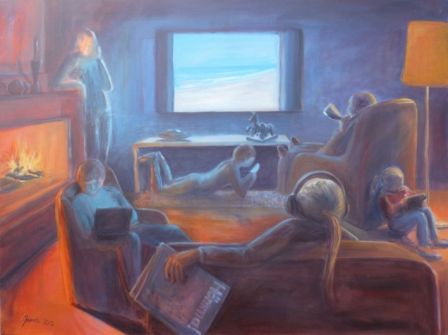 Mechtild HORATZ (D) lässt in ihrem großformatigen Werk „Gemeinsam“ drei Generationen um ein loderndes Kaminfeuer gemütlich beisammen sein. Nur scheinbar ist es der Inbegriff einer harmonischen Familie – ist doch jeder für sich mit einem technischen Gerät beschäftigt – also „gemeinsam und doch einsam“. „Was würde geschehen, wenn man die Technik mal bewusst abschalten würde – die Chancen auf einen wirklichen Familienabend ständen nicht schlecht und „gemeinsam“ hätten wir wieder eine Chance…“, meint die Künstlerin.