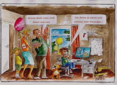 Lutz NOWOTNY verpackt in seine Cartoons immer wieder heitere Botschaften, die sowohl zum Schmunzeln als auch zum Nachdenken anregen. Gezeichneter Humor dient ihm als treffende Antwort und listige Notwehr dem Alltag gegenüber und als Hilfe um halbwegs unversehrtan Gemüt und Seele durch Bad News zu kommen. „Facebook Geburtstag“ ist ein typisches Beispiel aus einem Familienalltag der Social Media-Generation.