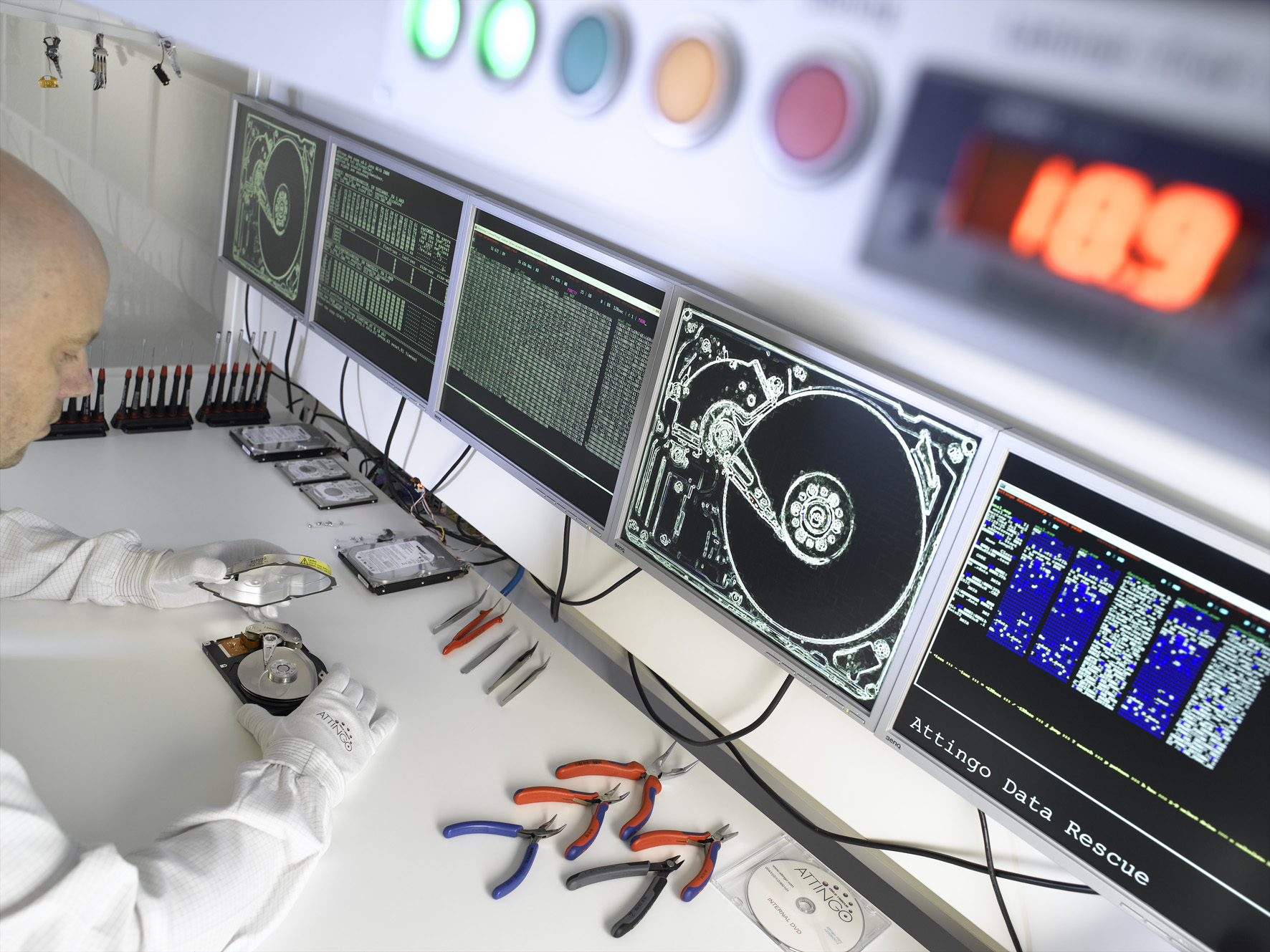 Deshalb bieten die Datenretter von Attingo für dringende Fälle das High-Priority Service an: Die Bearbeitung der Datenrettungsfälle erfolgt dann rund um die Uhr, sieben Tage die Woche. Aufgrund des zunehmenden Bedarfs hat Attingo das Personal aufgestockt und die Labors ausgebaut. Nur mit entsprechender Infrastruktur kann man dem steigenden Bedarf am Notfall-Service gerecht werden: Hauseigene Reinraumlabors, Ersatzteillager mit zehntausenden Festplatten sowie Techniker mit jahrzehntelanger Erfahrung in der Datenrettung garantieren die schnellstmögliche Rekonstruktion der Daten. Auch bei komplexen Server- und RAID-Systemen kann Attingo Datenrettung oft innerhalb weniger Stunden die geretteten Daten an den Kunden ausliefern. Höchste Qualität der internen Prozesse wird durch die ISO 9001 Zertifizierung gewährleistet.