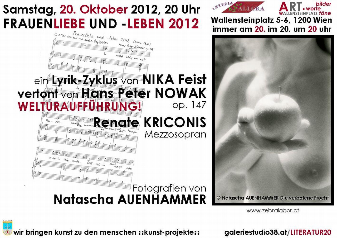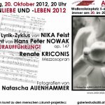 Am 20. Oktober wird die Reihe „bilder.worte.töne“in der Osteria am Wallensteinplatz Schauplatz eines ganz besonderen Ereignisses! Zur „Welturaufführung“ mit Lesung und Gesang gelangt der gesamteLied-Zyklus, den der in der Brigittenau lebende Komponist und Pianist HansPeter Nowak unter dem Titel „Frauenliebe und –leben 2012“ nach 17 Gedichten der Künstlerin NIKA Feist vertont hat. Die ebenfalls in der Brigittenau lebende Mezzosopranistin Renate Kriconis wird, begleitet von Hans Peter Nowak am Keyboard, die Liederinterpretieren.