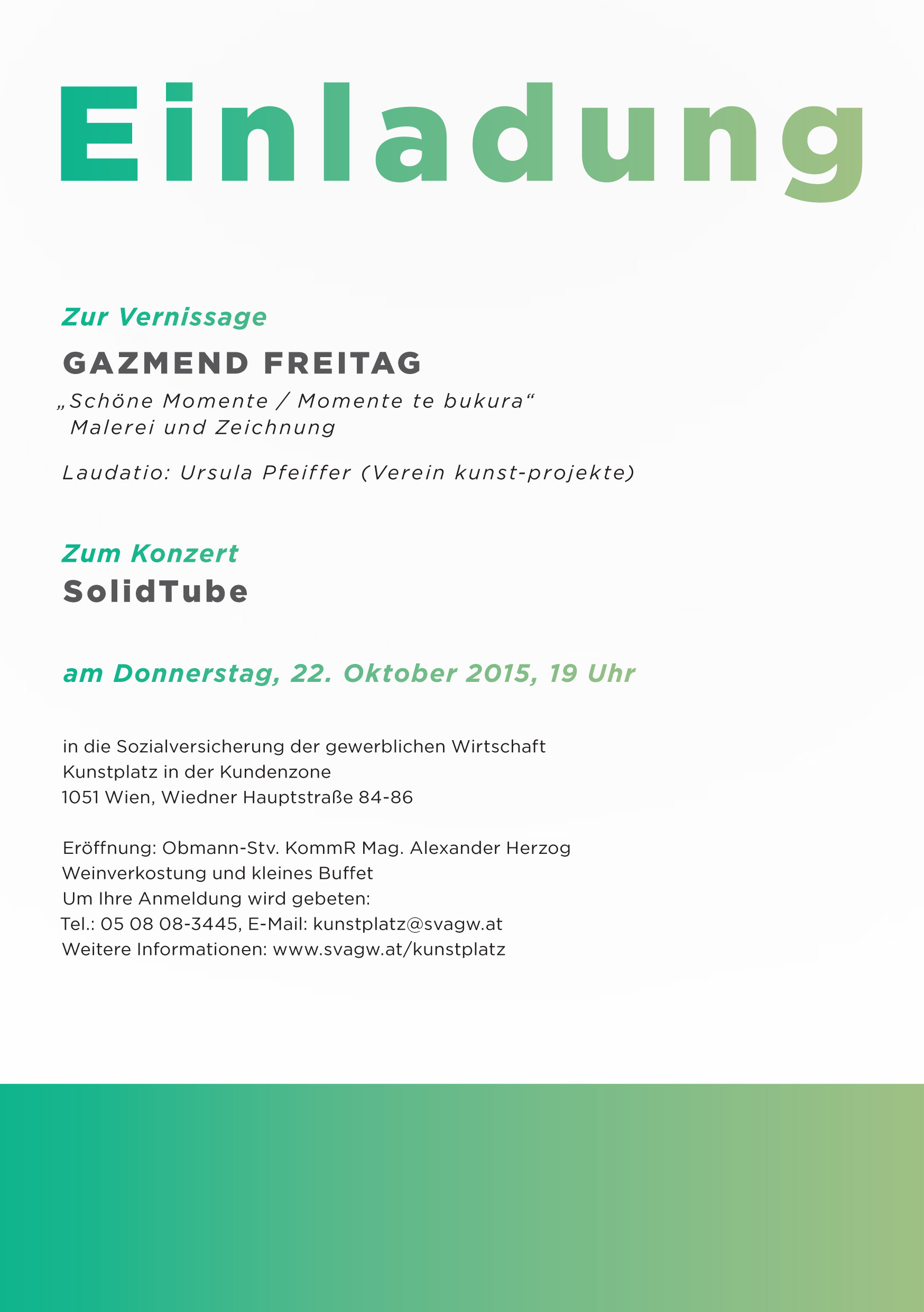 Donnerstag, 22. Oktober 2015 um 19 Uhr (Einlass ab 18:45 Uhr) SVA der gewerblichen Wirtschaft, Kunstplatz in der Kundenzone Wiedner Hauptstraße 84-86, 1051 Wien