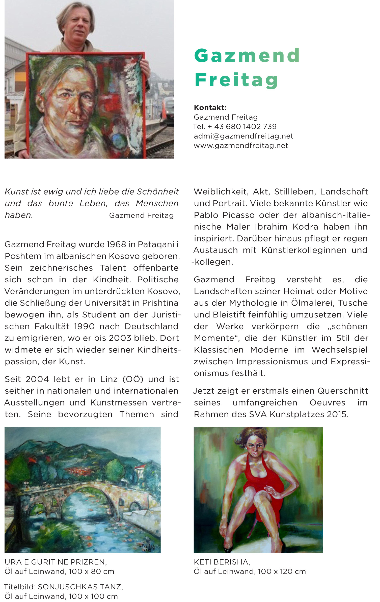 Gazmend Freitag wurde 1968 in Pataqani i Poshtem im albanischen Kosovo geboren. Sein zeichnerisches Talent offenbarte sich schon in der Kindheit. Politische Veränderungen im unterdrückten Kosovo, die Schließung der Universität in Prishtina zwangen ihn zur Emigration nach Deutschland. Dort widmete er sichwieder seiner Kindheitspassion, der Kunst. Seit 2004 lebt er in Linz (OÖ) und ist seither in nationalen und internationalen Ausstellungen und Kunstmessen vertreten und betreibt regen Austausch mit anderen Künstlerinnen und Künstlern.Mitglied bei ::kunst-projekte::